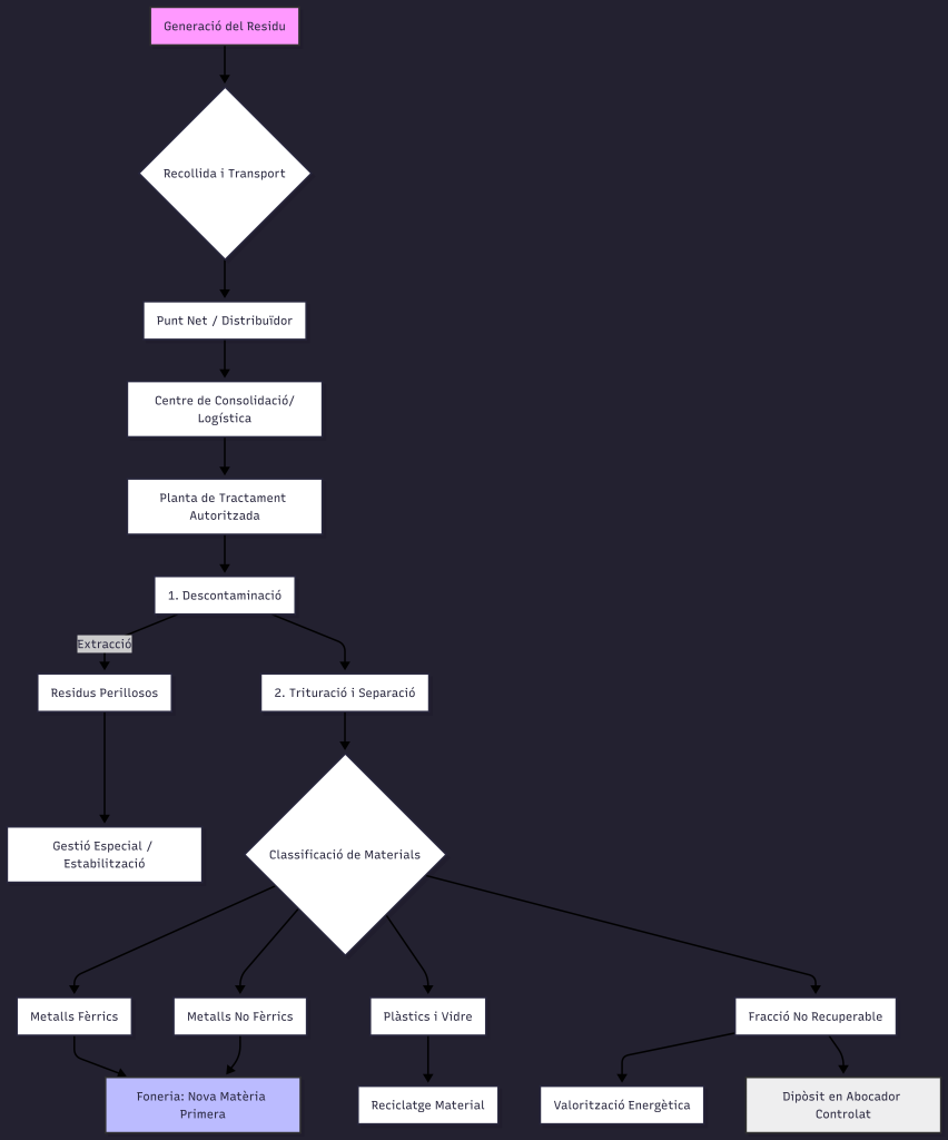 2. Trituració i Separació: Es divideixen els materials (ferrics, no fèrrics, plàstics, vidre).