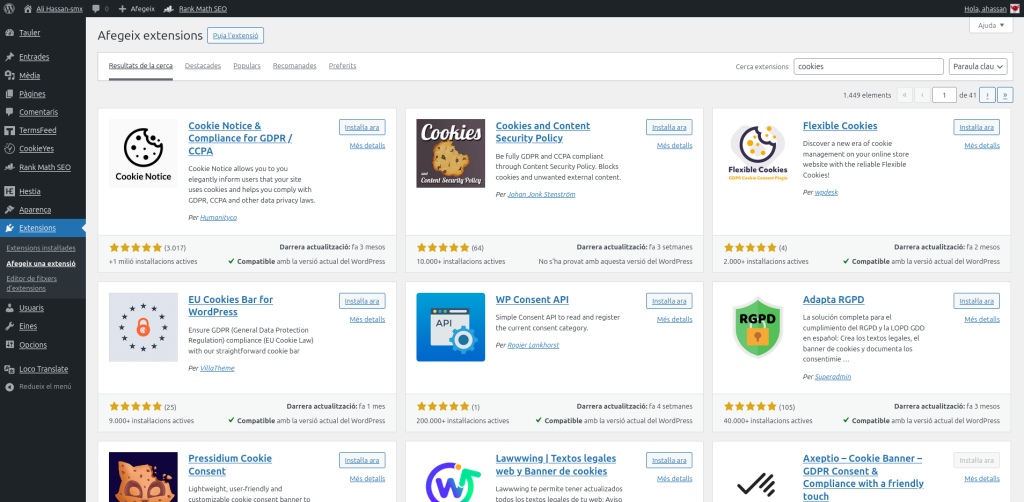 WordPress no té una funció nativa per mostrar el missatge de galetes, per això el més habitual és utilitzar un plugin. para el uso de plugins tienes que ir a extensiones y en la barra de busqueda buscar cookies y apareceran muchas opciones de cookies y selecciona la que quieras poner en tu pagina de wordpress