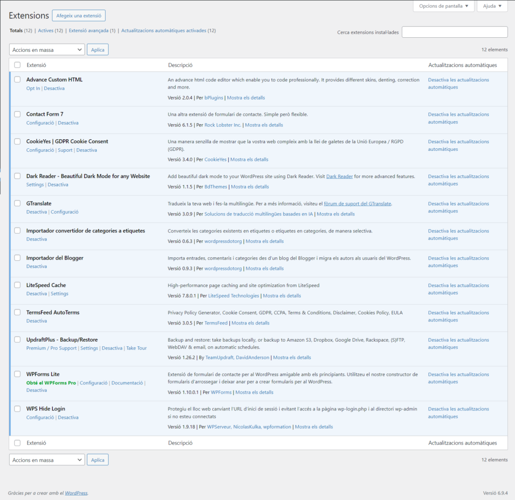 Aqui estan el plugins que estic utilitzan pel meu wordpress: