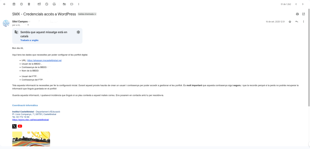 Per fer el desplegament de WordPress ens van enviar un correu amb les nostres dades per poder Iniciar sessió.