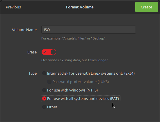 Posem NOM i activarem el botó Erase i la opcio de Fat i fem clic en botó Create,