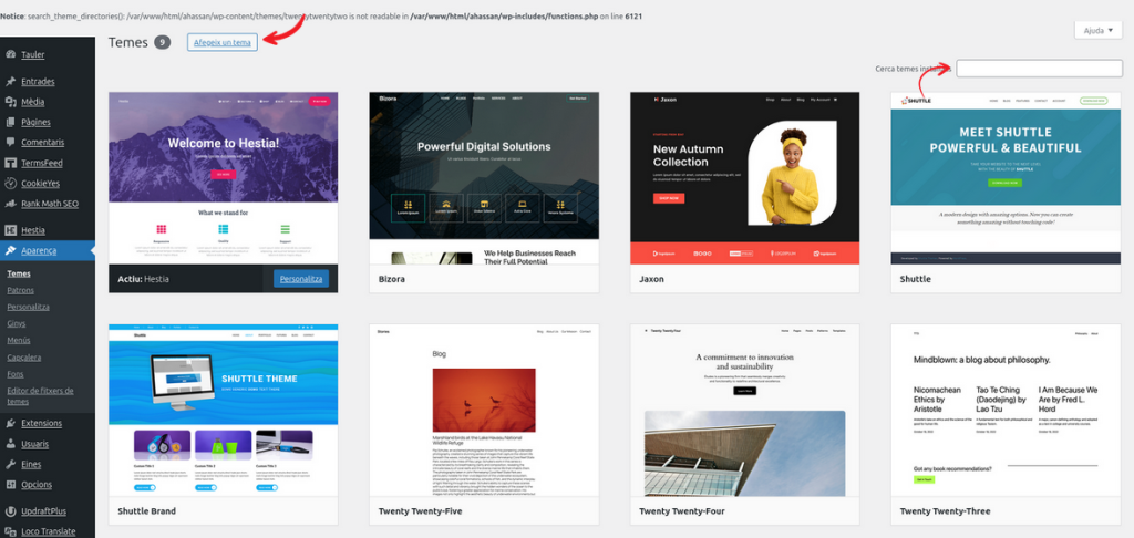 Quan entreu en temes, heu de fer clic a “Afegeix un tema” i podeu seleccionar el tema que vulgueu i a la part superior dreta podeu triar el tipus de tema que vulgueu posar-lo a la vostra pàgina de WordPress.