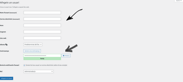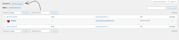 “Entra a WordPress, inicia sessió com a administrador. A la part dreta veuràs una secció que posa ‘Usuaris’. Li dones a ‘Afegir un nou usuari’ i posis les credencials que et demana.”