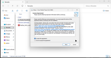 a continuació, aneu al fitxer on heu descarregat el rastrejador de packet tracer i obriu-lo.i després feu clic a l’opció i agree the agreement i feu clic a Següent.
