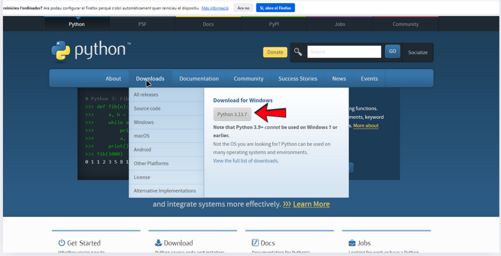Luego vaya a la opción de descarga y luego haga clic en Python 3.13.7.